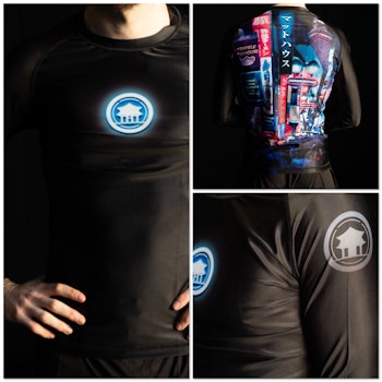 Tokyo Long Sleeve Rush Guard, with blue glowing logo at the front and big Tokyo street inspired design on the back done by Mark Stroud. .