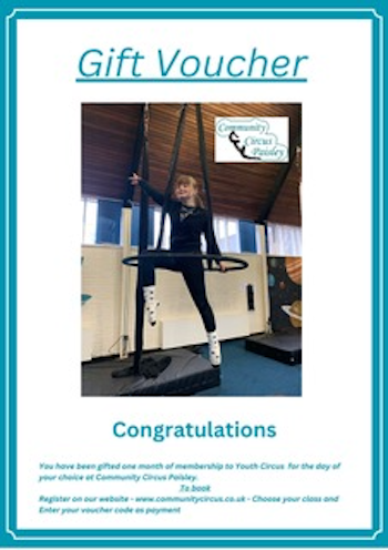 Valid for any youth classes for 1 months membership. Valid for 12 months from purchase date. Email info@communitycircus.co.uk if you'd like a fancier certificate to print.