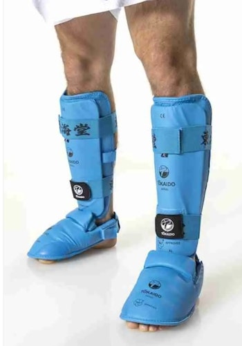 TOKAIDO Shin/Foot Guards, WKF Approved, Blue/Red for KARATE training and competition. The foot protectors are a combination of karate foot and shin protection that are interconnected with a velcro interconnection. You are guaranteed optimum safety and freedom of movement whilst wearing these.